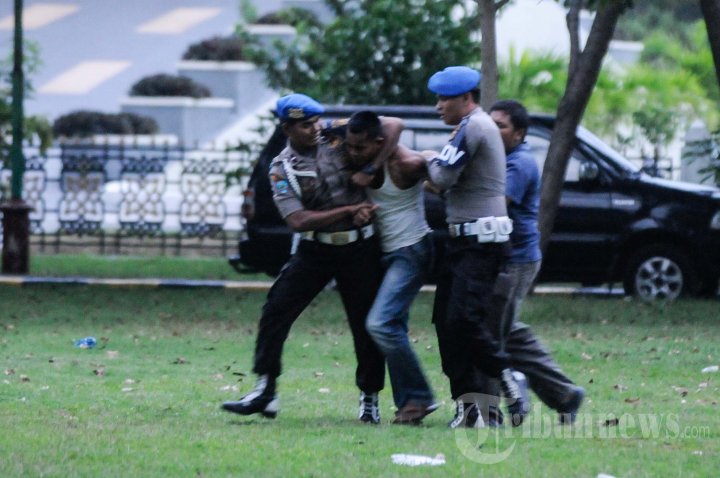 Polisi mengamankan warga yang diduga memprovokasi massa yang melakukan aksi unjuk rasa di depan Kantor Gubernur Aceh, Banda Aceh, Jumat (27/12/2013). Aksi menuntut janji uang Rp 500 ribu dari Pemerintah Aceh tersebut berlangsung ricuh sehingga polisi terpaksa membubarkan massa dengan melakukan tembakan ke udara. SERAMBI INDONESIA/M ANSHAR