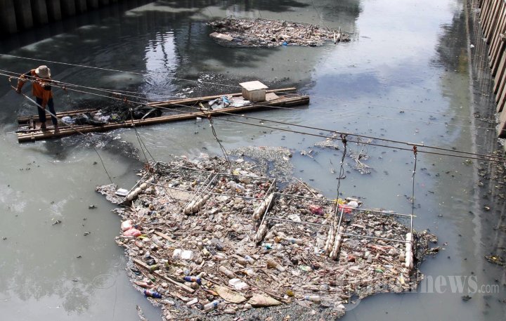 Pak Oke, petugas kebersihan sedang memungut sampah yang tersangkut pada alat perangkap sampah (trap) di Kali Cideng, yang mengalir di kawasan Kampung Bali, Tanah Abang, Jakarta Pusat, Sabtu (4/1/2014). Dinas Kebersihan DKI Jakarta, memasang alat baru berupa jaring perangkap sampah yang bekerja secara manual di sejumlah sungai di ibukota untuk mengoptimalkan kerja bersih-bersih sampah di sungai. (Warta Kota/Nur Ichsan)