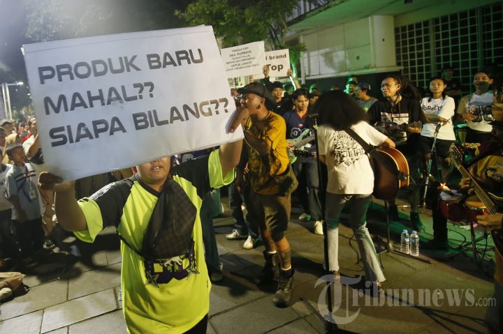 Sejumlah seniman, konten creator dan masyarakat membawa poster dukungan produk UMKM konveksi pada aksi seni di Kota Tua, Jakarta, Minggu (16/11/2025). Kegiatan yang diselenggarakan oleh pelaku UMKM Konveksi Sinergi Adv Nusantara bersama musisi Marjinal, Orkes Trotoar, Angklung Ramawijaya serta para para konten kreator Buntung Cees, Katababa, serta komunitas Citayam All Star yang diikuti Bonge, Jeje, Roy, Kurma, Alpin, Awwa, Della, Badru, Salsa, Jajat dan lainnya sebagai bentuk terima kasih kepada pemerintah karena sudah memberhentikan impor pakaian bekas ilegal. Tribunnews/Jeprima