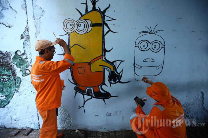 Petugas PPSU Kelurahan Kebon Manggis, membuat mural di kawasan Matraman, Jakarta Timur, Rabu (21/12/2022). Pembuatan mural tersebut bertujuan untuk mempercantik Ibukota dengan penuh warna-warni oleh seni lukis. (Warta Kota/Angga Bhagya Nugraha)