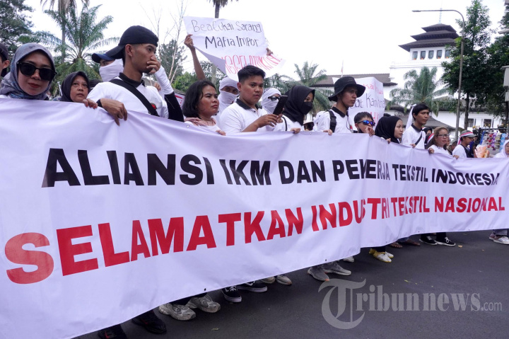 Massa yang tergabung dalam Aliansi IKM (Industri Kecil Menengah), Pekerja dan Masyarakat Tekstil Nasional menggelar aksi unjuk rasa "Stop PHK, Selamatkan Industri Tekstil Indonesia" berjalan kaki menuju Gedung DPRD Provinsi Jawa Barat, melintas di depan Gedung Sate, Jalan Diponegoro, Kota Bandung, Jawa Barat, Jumat (5/7/2024). Dalam aksinya, mereka mengatakan pemutusan hubungan kerja (PHK) dan penutupan industri tekstil dan produk tekstik (TPT) bersekala besar, menengah dan kecil karena maraknya praktik impor ilegal yang melibatkan pejabat/pegawai kementerian, importir nakal, hingga aparat penegak hukum sebagai sindikat mafia impor yang bersarang di Ditjen Bea Cukai Kementerian Keuangan. Atas hal tersebut, mereka meminta kepada Presiden Joko Widodo (Jokowi) untuk turun langsung menyelamatkan industri TPT nasional karena para menteri di kabinet sudah tidak mampu melawan sindikat mafia impor. Serta menyerukan kepada pemerintah daerah untuk mendukung produk dalam negeri serta memberangus barang-barang impor yang saat ini sudah beredar hingga pelosok. (TRIBUN JABAR/GANI KURNIAWAN)