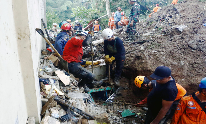 Ratusan aparat gabungan terus melakukan pengerukan tanah dengan alat seadanya di tempat kejadian korban tanah longsor di Desa Sirna Sari, Empang, Bogor Selatan, Jawa Barat, Rabu (15/3/2023). Sedikitnya terdapat 5 rumah dan 17 jiwa yang terdampak, 11 jiwa dapat terselamatkan dan 2 jiwa ditemukan dalam keadaan meninggal dunia sedangkan 4 jiwa masih dalam tahap proses pencarian tim gabungan. Warta Kota/YULIANTO