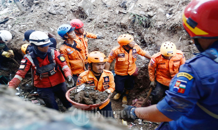 Ratusan aparat gabungan terus melakukan pengerukan tanah dengan alat seadanya di tempat kejadian korban tanah longsor di Desa Sirna Sari, Empang, Bogor Selatan, Jawa Barat, Rabu (15/3/2023). Sedikitnya terdapat 5 rumah dan 17 jiwa yang terdampak, 11 jiwa dapat terselamatkan dan 2 jiwa ditemukan dalam keadaan meninggal dunia sedangkan 4 jiwa masih dalam tahap proses pencarian tim gabungan. Warta Kota/YULIANTO