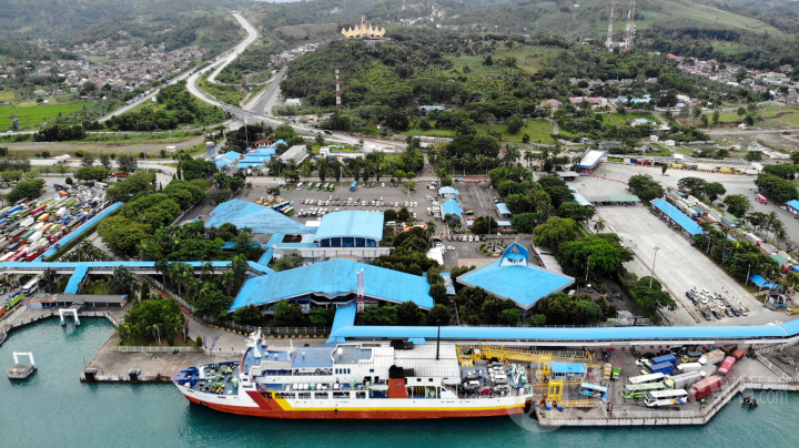 Foto udara suasana Pelabuhan Penyeberangan Bakauheni di Bakauheni, Lampung Selatan, Lampung, Selasa (26/4/2022). Berdasarkan data posko PT ASDP Cabang Bakauheni Lampung Selatan, pada 25 April 2022 pukul 08.00 WIB hingga 26 April 2022 pukul 08.00 WIB, total penumpang yang menyeberang ke Pulau Jawa melalui Pelabuhan Bakauheni sebanyak 35.075 orang dan total kendaraan yang menyeberang sebanyak 6.997 unit. TRIBUN LAMPUNG/DENI SAPUTRA
