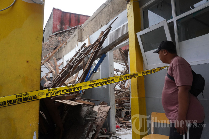 ATAP AMBRUK - Seorang pekerja bangunan melihat atap bangunan ruang kelas yang ambruk di SMP Pasundan 1, Jalan Pasundan, Kelurahan Balonggede, Kota Bandung, Jawa Barat, Senin (3/11/2025). Ambruknya atap ruang kelas tersebut terjadi sekitar pukul 11.00 WIB hingga mengakibatkan enam orang pelajar dan seorang pekerja bangunan mengalami luka ringan terdampak reruntuhan. Para korban terdampak langsung dilarikan ke Rumah Sakit Bandung Kiwari untuk mendapat perawatan. Kelas yang atapnya ambruk tersebut merupakan bangunan yang sudah tua yang sudak diusulkan bantuan revitalisasi kepada Dinas Pendidikan Kota Bandung. (TRIBUN JABAR/GANI KURNIAWAN)