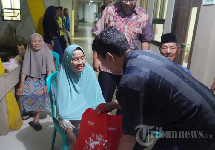 Manager Marketing Tribun Bekasi Hery Effendi (kanan) saat menyerahkan paket bantuan sembako dari Alfamidi yang diwakili Yayasan Mizan dan Tribun Bekasi yang diterima langsung oleh salah satu pegawai Panti Sosial Rehabilitasi Lanjut Usia di Teluk Jambe, Karawang, Jawa Barat, Jumat (23/12/2022). Dalam rangka memperingati Hari Ibu, Alfamidi lewat Yayasan Mizan bekerja sama dengan Tribun Bekasi menyalurkan paket sembako kepada para penghuni panti sosial rehabilitasi lanjut usia. Warta Kota/YULIANTO