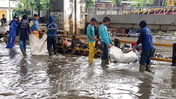 LUAPAN KALI SABI TANGERANG - Petugas Operasi dan Pemeliharaan Drainase PUPR Kota Tangerang, membersihkan sampah yang tersangkut di jembatan Kali Sabi yang meluap di Jalan Gatot Subroto, Cibodas, Kota Tangerang, Sabtu (16/7/2022). Tumpukan sampah ini terbawa arus air dan tersangkut di badan jembatan yang berada di bawah Flyover Cibodas saat banjir menerjang kawasan tersebut. WARTA KOTA/NUR ICHSAN