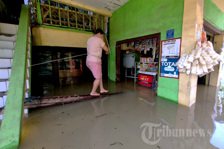 Pemilik rumah menggunakaan kayu untuk melintas ke warungnya yang terendam banjir, di Kampung Bojongasih, Desa/Kecamatan Dayeuhkolot, Kabupaten Bandung, Kamis (21/11/2024). Kampung Bojongasih sudah dua hari terendam banjir akibat meluapnya air dari Sungai Citarum setelah hujan mengguyur Bandung secara merata dalam durasi yang lama. Banjir juga merendam Jalan Raya Dayeuhkolot yang berdampak menghambat aktivitas warga. (TRIBUN JABAR/GANI KURNIAWAN)