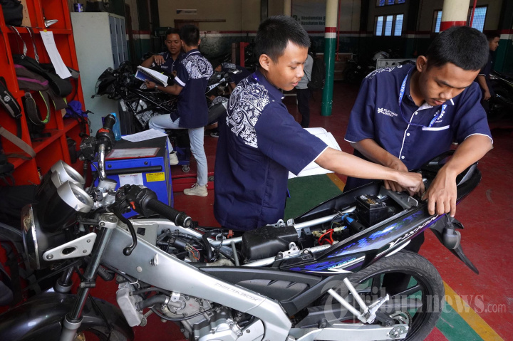 Peserta Angkatan 2023 melakukan perbaikan kendaraan roda dua saat mengikuti pelatihan vokasi Jurusan Teknik Otomotif di Balai Besar Pelatihan Vokasi dan Produktivitas (BBPVP) Bandung, Jalan Gatot Subroto, Kota Bandung, Jawa Barat, Rabu (18/10/2023). BBPVP Bandung pada 2024 mendatang akan menambah kuota peserta pelatihan dari 8.000 orang di 2023 menjadi 10.000 orang dengan target yakni warga pencari kerja serta yang ingin merubah kompotensi dari yang sebelumnya dimiliki atau menambah kompetensi menjadi ahli teknologi informasi dan komunikasi (TIK), manufaktur, otomotif atau regrigeration (AC). Pelatihan ini gratis dan terbuka untuk umum dengan syarat cukup memiliki akun siapkerja (aplikasi) dan datang langsung ke Kantor BBPVP Bandung. Biaya akomodasi, pelatihan, konsumsi dan sebagainya ditanggung BBPVP Bandung. BBPVP Bandung juga akan menggelar Semarak Bulan Pelatihan Vokasi pada 20- 21 Oktober 2023, dengan menghadirkan job fair, trial class, fun walk, fun games, ngobrol bareng komunitas, serta konser musik Samsaka dan Letto. (TRIBUN JABAR/GANI KURNIAWAN)