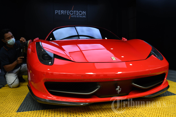 Pekerja melakukan glass coating pada mobil Ferrari di Perfection Auto Gallery, Kota Surabaya, Jawa Timur, Senin (7/3/2022). Glass coating merupakan solusi jitu perawatan mobil agar tetap tahan cuaca dan warna tak mudah pudar, terlebih lagi untuk mobil jenis super car. SURYA/AHMAD ZAIMUL HAQ
