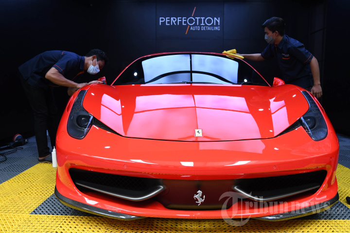 Pekerja melakukan glass coating pada mobil Ferrari di Perfection Auto Gallery, Kota Surabaya, Jawa Timur, Senin (7/3/2022). Glass coating merupakan solusi jitu perawatan mobil agar tetap tahan cuaca dan warna tak mudah pudar, terlebih lagi untuk mobil jenis super car. SURYA/AHMAD ZAIMUL HAQ
