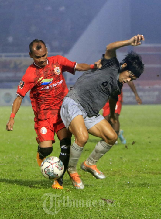 BORNEO FC MENANG - Pesepakbola Borneo FC, Kei Hirose berebut bola dengan pesepakbola Persija Jakarta, Riko Simanjuntak pada pertandingan Presiden Grup B di Stadion Segiri Samarinda, Kalimantan Timur, Sabtu (25/6/2022). Borneo FC berhasil mengalahkan Persija Jakarta 2-1(TRIBUNKALTIM/NEVRIANTO HARDI PRASETYO)