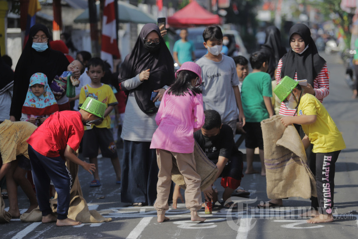 Anak-anak antusias mengikuti perlombaan 17 Agustusan di Jalan Cipinang Muara 3 Jakarta Timur, Minggu (14/8/2022). Perlombaan dalam rangka memeriahkan HUT ke-77 RI kembali diselenggarakan di sejumlah tempat setelah dua tahun ditiadakan akibat pandemi Covid-19. TRIBUNNEWS/HERUDIN