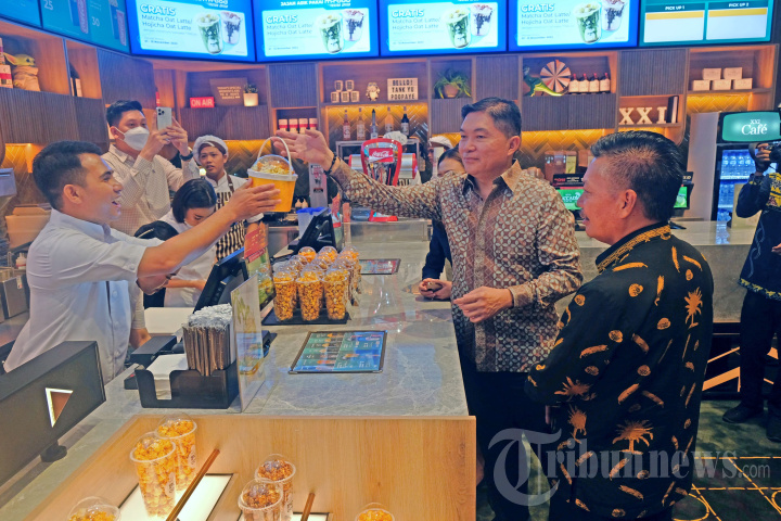 Direktur Cinema XXI Dody Suhartono akan menyerahkan salah satu produk unggulan di XXI Cafe, yakni Popcorn kepada Asisten 2 bidang Perekonomian dan Pembangunan Sekretariat Kota Kendari Jahudding. Beragam produk makanan dan minuman berkualitas tersedia di The Park Kendari XXI untuk semakin melengkapi pengalaman menonton terbaik. TRIBUNNEWS/HO