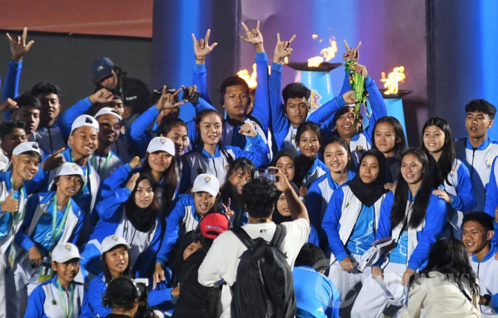 Sejumlah atlet dari kontingen Kota Malang berfoto di api Porprov usai parade defile atlet pada penutupan atau closing ceremony Pekan Olahraga Jawa Timur (Porprov Jatim) IX 2025 di Stadion Kanjuruhan, Kabupaten Malang, Jawa Timur, Sabtu (5/7/2025). Kota Surabaya menjadi juara umum pada Porprov Jatim 2025 dan menjadi tuan rumah pada Porprov 2027. TRIBUN JATIM/PURWANTO