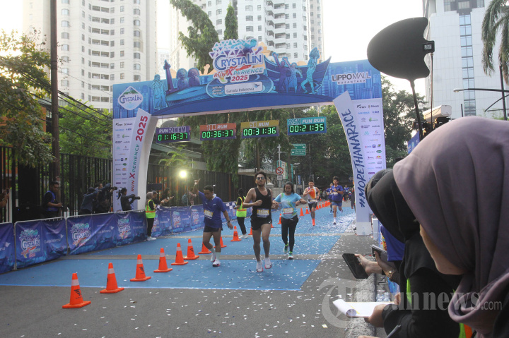 Crystalin RunXperience 2025 - Pelari melintasi garis Finish, dalam acara Crystalin RunXperience 2025 di Lippo Mall Nusantara, Semanggi, Minggu (12/10/2025). Crystalin RunXperience 2025 hadir lebih lengkap dengan tambahan kategori Half Marathon 21K, melengkapi kategori populer 2.5K Fun Run, 5K, dan 10K serta tiga pengalaman unik Crystalin RunXperience 2025, More Than a Race, yang diikuti oleh 8.000 pelari.
