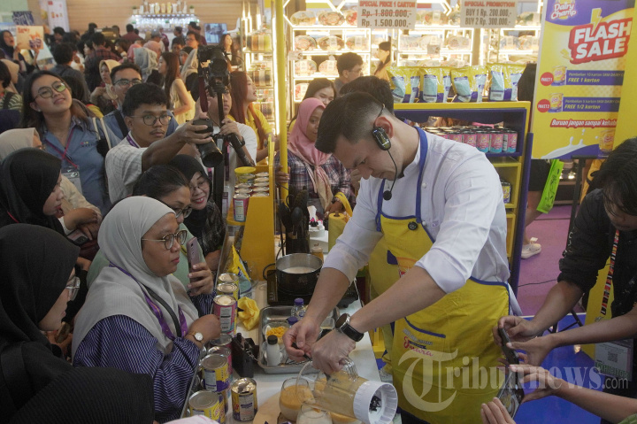 Juara MasterChef Indonesia Season 7 Chef Jerry Andrean saat sesi cooking demo eksklusif dengan memperkenalkan resep dessert terbaru menggunakan produk Dairy Champ yang cocok untuk peluang usaha yaitu Mango Coconut Panna Cotta Juara pada pameran internasional SIAL InterFOOD 2025 di Jakarta International Expo (JIExpo) Kemayoran, Jakarta Pusat, Sabtu (15/11/2025). Lewat kolaborasi dengan Chef Jerry Andrean dengan menghadirkan ide resep yang mudah diterapkan menjadi salah satu langkah inovatif Dairy Champ dalam menghadirkan inspirasi baru bagi pelaku usaha kuliner untuk menemukan peluang menu yang kreatif, efisien, dan bernilai jual tinggi bagi pelaku bisnis kuliner di Indonesia. Tribunnews/Jeprima