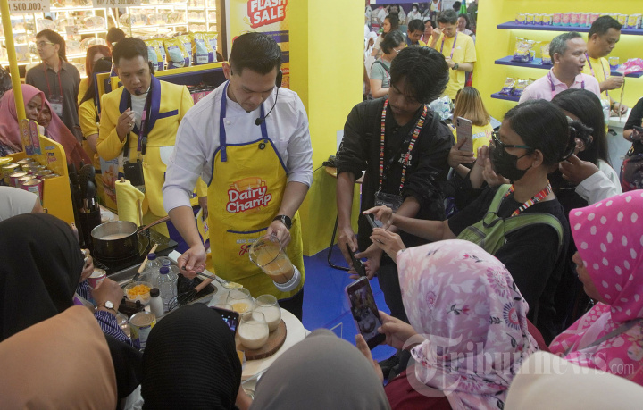 Juara MasterChef Indonesia Season 7 Chef Jerry Andrean saat sesi cooking demo eksklusif dengan memperkenalkan resep dessert terbaru menggunakan produk Dairy Champ yang cocok untuk peluang usaha yaitu Mango Coconut Panna Cotta Juara pada pameran internasional SIAL InterFOOD 2025 di Jakarta International Expo (JIExpo) Kemayoran, Jakarta Pusat, Sabtu (15/11/2025). Lewat kolaborasi dengan Chef Jerry Andrean dengan menghadirkan ide resep yang mudah diterapkan menjadi salah satu langkah inovatif Dairy Champ dalam menghadirkan inspirasi baru bagi pelaku usaha kuliner untuk menemukan peluang menu yang kreatif, efisien, dan bernilai jual tinggi bagi pelaku bisnis kuliner di Indonesia. Tribunnews/Jeprima