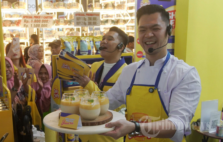 Juara MasterChef Indonesia Season 7 Chef Jerry Andrean menunjukkan menu dessert yang telah dibuat usai sesi cooking demo eksklusif pada pameran internasional SIAL InterFOOD 2025 di Jakarta International Expo (JIExpo) Kemayoran, Jakarta Pusat, Sabtu (15/11/2025). Lewat kolaborasi dengan Chef Jerry Andrean dengan menghadirkan ide resep yang mudah diterapkan menjadi salah satu langkah inovatif Dairy Champ dalam menghadirkan inspirasi baru bagi pelaku usaha kuliner untuk menemukan peluang menu yang kreatif, efisien, dan bernilai jual tinggi bagi pelaku bisnis kuliner di Indonesia. Tribunnews/Jeprima