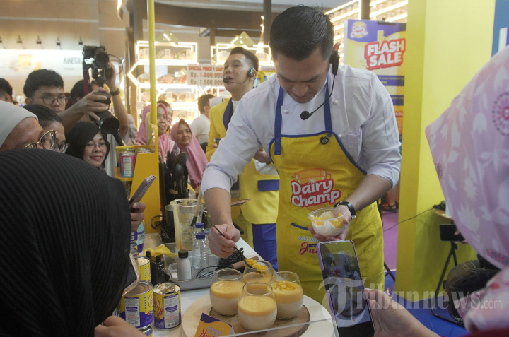 Juara MasterChef Indonesia Season 7 Chef Jerry Andrean saat sesi cooking demo eksklusif dengan memperkenalkan resep dessert terbaru menggunakan produk Dairy Champ yang cocok untuk peluang usaha yaitu Mango Coconut Panna Cotta Juara pada pameran internasional SIAL InterFOOD 2025 di Jakarta International Expo (JIExpo) Kemayoran, Jakarta Pusat, Sabtu (15/11/2025). Lewat kolaborasi dengan Chef Jerry Andrean dengan menghadirkan ide resep yang mudah diterapkan menjadi salah satu langkah inovatif Dairy Champ dalam menghadirkan inspirasi baru bagi pelaku usaha kuliner untuk menemukan peluang menu yang kreatif, efisien, dan bernilai jual tinggi bagi pelaku bisnis kuliner di Indonesia. Tribunnews/Jeprima