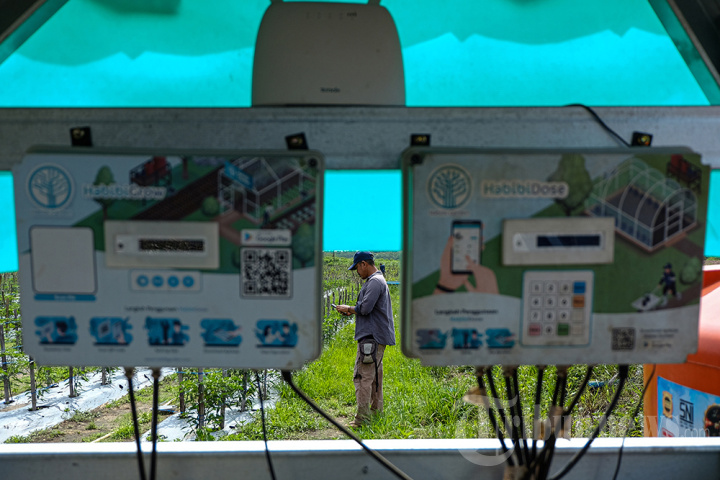 Ferry, Wakil ketua kelompok tani Sriwijaya Bakung 1 mencoba melakukan penyiraman tanaman cabai dengan pengoperasian secara online melalui smartphone miliknya atau metode Digital Farming di Sriwijaya Science Techno Park, Desa Bakung, Kecamatan Indralaya Utara, Kabupaten Ogan Ilir, Sumatera Selatan, Kamis (20/10/2022).Dengan metode Digital Farming petani dapat dengan efesien untuk memonitoring pemupukan dan pengairan.Indonesia mendorong pemerataan literasi dan keterampilan digital masyarakat sebagai salah satu prasyarat transformasi digital yang inklusif sehingga semua orang dapat memanfaatkan ruang digital secara produktif dan dinamis untuk meningkatkan jumlah sumber daya manusia yang cakap teknologi serta mendorong pertumbuhan nilai-nilai ekonomi baru untuk mewujudkan ekosistem digital yang inklusif, memberdayakan, dan berkelanjutan.TRIBUN SUMSEL/ABRIANSYAH LIBERTO