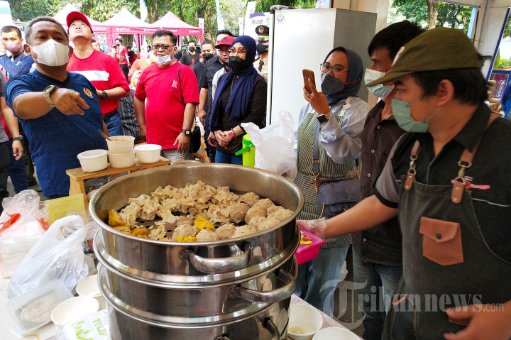 Wali Kota Bandung, Yana Mulyana meninjau jajanan kuliner yang dijual pada gelaran Bandung Seuhah Jilid 2 di area parkir Plaza Balai Kota Bandung, Jalan Wastukencana, Kota Bandung, Jawa Barat, Sabtu (3/9/2022). Bazar yang diikuti sekitar 50 pedagang tersebut dalam rangka pemulihan enonomi nasional khususnya Kota Bandung, sekaligus upaya promosi jajanan khas Kota Bandung. TRIBUN JABAR/GANI KURNIAWAN