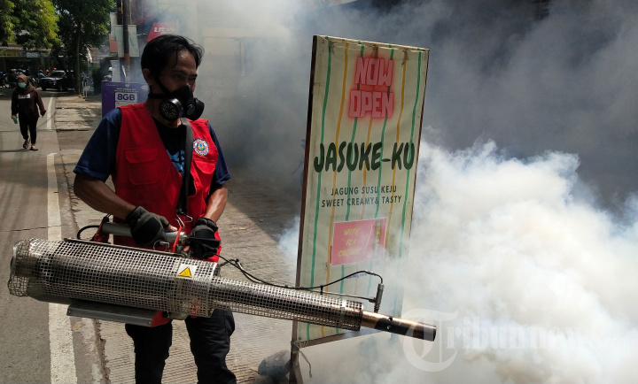 Petugas PMI Kota Bandung melakukan pengasapan (fogging) di lingkungan RW 05, Kelurahan Antapani Kidul, Kecamatan Antapani, Kota Bandung, Jawa Barat, Rabu (12/1/2022). Fogging ini dilakukan sebagai bentuk pemberantasan sarang nyamuk untuk mencegah penyakit DBD (Demam Berdarah Dengue). Disamping itu juga harus dilakukan dengan menerapkan 3M, yaitu menguras tempat penampungan air, menutup tempat penampungan air, dan mengubur barang bekas. TRIBUN JABAR/GANI KURNIAWAN