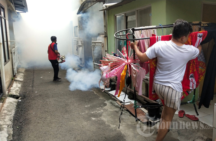 Petugas PMI Kota Bandung melakukan pengasapan (fogging) di lingkungan RW 05, Kelurahan Antapani Kidul, Kecamatan Antapani, Kota Bandung, Jawa Barat, Rabu (12/1/2022). Fogging ini dilakukan sebagai bentuk pemberantasan sarang nyamuk untuk mencegah penyakit DBD (Demam Berdarah Dengue). Disamping itu juga harus dilakukan dengan menerapkan 3M, yaitu menguras tempat penampungan air, menutup tempat penampungan air, dan mengubur barang bekas. TRIBUN JABAR/GANI KURNIAWAN