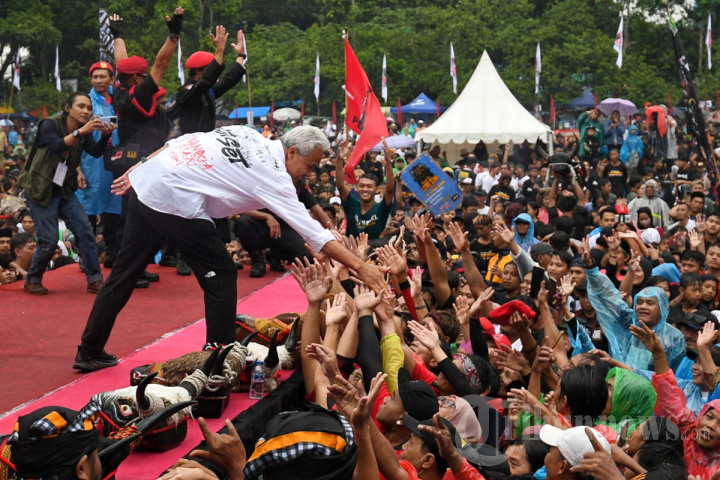 Calon Presiden nomor urut 03 Ganjar Pranowo bersalaman dengan para pelaku seni bantengan saat menghadiri Hajatan Rakyat 1000 Bantengan bersama Ganjar - Mahfud di lapangan Gor Ken Arok, Kota Malang, Jawa Timur, Selasa (30/1/2024). Ganjar Pranowo mengajak bersama ribuan seniman bantengan memenangkan Ganjar - Mahfud pada pemilu 2024 mendatang. SURYA/PURWANTO