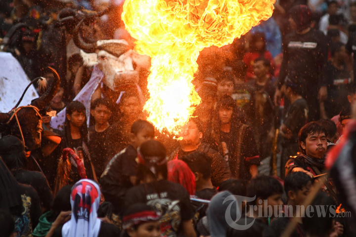 Ribuan pelaku seni bantengan saat menghadiri Hajatan Rakyat 1000 Bantengan bersama Ganjar - Mahfud di lapangan Gor Ken Arok, Kota Malang, Jawa Timur, Selasa (30/1/2024). Ganjar Pranowo mengajak bersama ribuan seniman bantengan memenangkan Ganjar - Mahfud pada pemilu 2024 mendatang. SURYA/PURWANTO