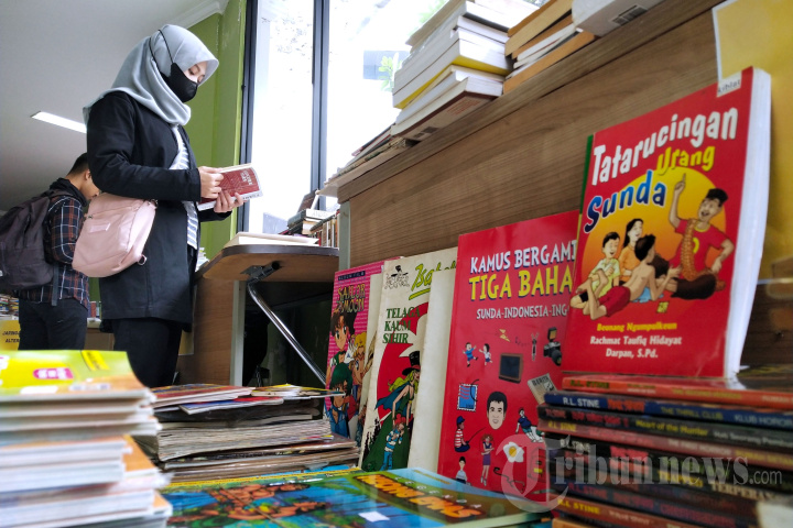 Pengunjung melihat-lihat buku yang dipamerkan pada gelaran "Haus Buku 3" di Gedung Perpustakaan Ajip Rosidi, Jalan Garut, Kota Bandung, Jawa Barat, Jumat (10/2/2023). Acara yang berkolaborasi bersama Forum Taman Baca Masyarakat (TBA) Jawa Barat tersebut menyajikan pameran arsip, lapakan buku, diskusi, dan bedah buku, serta penampilan seni musik, puisi, dan dongeng. Sementara delapan lapakan buku yang hadir memeriahkan kegiatan ini yakni Pustaka Jaya, Lawang Buku, Jaringan Buku Alternatif, Rasia Bandoeng, James Books, Toko kenangan Asyik, Katarsis Book, dan Mantra Books. Kegiatan akan berlangsung hingga Minggu, 12 Februari 2023. TRIBUN JABAR/GANI KURNIAWAN