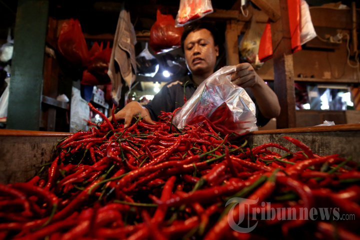 Penjual merapikan cabai yang dijual di Pasar Senen, Jakarta Pusat, Selasa (5/4/2022). Memasuki awal Ramadan tahun ini, harga sejumlah kebutuhan pokok terpantau naik. Cabai-cabaian menjadi yang paling mencolok. Mengutip catatan Pusat Informasi Harga Pangan Strategis (PIHPS), harga rata-rata cabai merah keriting di pasar tradisional pada 4 April 2022 adalah Rp 58.900/kg. Melonjak Rp 9.000 dari akhir pekan lalu.Kemudian harga cabai rawit hijau ada di Rp 55.250/kg. Melesat Rp 8.400. Cabai rawit merah hari ini, harganya mencapai Rp 78.550/kg, meroket Rp 14.650. TRIBUNNEWS/IRWAN RISMAWAN
