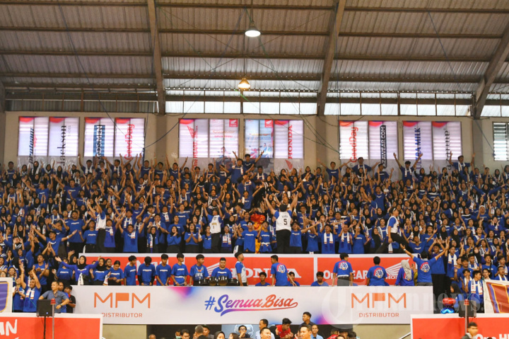 Suporter tim basket SMAN 3 Kota Malang, Bhawikarsu memberikan dukungan kepada tim bola basket SMAN 3 Kota Malang saat melawan tim basket SMAN 8 Kota Malang dalam laga Honda DBL (Developmental Basketball League) with Kopi Good Day 2023 East Java Series-South Region di Gelanggang Olahraga (GOR) Bimasakti Malang, Kamis (3/8/2023). SURYA/PURWANTO