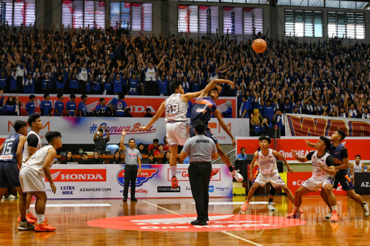 Pebasket SMAN 8 Kota Malang M Wilky Mario berebut bola dengan pebasket SMAN 3 Kota Malang Muhammad Hibban dalam laga Honda DBL (Developmental Basketball League) with Kopi Good Day 2023 East Java Series-South Region di Gelanggang Olahraga (GOR) Bimasakti Malang, Kamis (3/8/2023). SURYA/PURWANTO