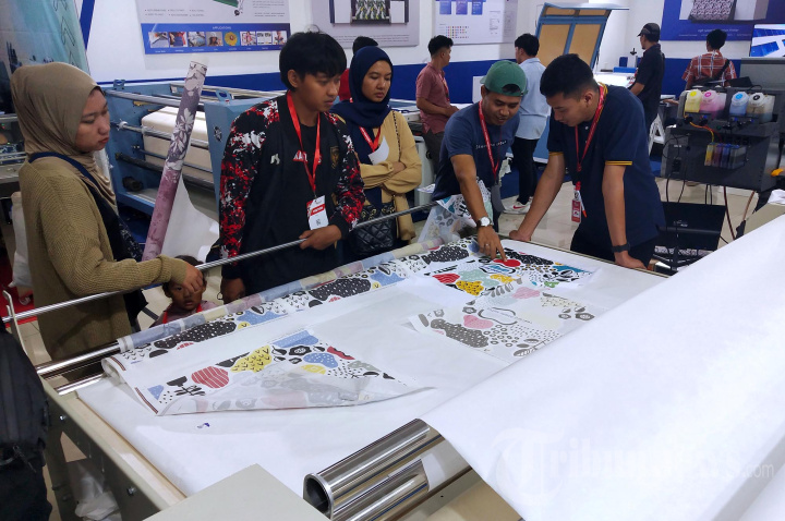 Pengunjung melihat mesin press sublim untuk mentrasfer gambar dari kertas ke kain yang dipamerkan pada gelaran Indonesia Apparel Production Expo (IAPE) Bandung 2023 di Bandung Convention Center (BCC), Jalan Soekarno Hatta, Kota Bandung, Jawa Barat, Sabtu (18/11/2023). Pameran ini menghadirkan informasi bisnis dan teknologi terbaru di bidang Industri garment, konveksi, sablon, dan digital printing textile. (TRIBUN JABAR/GANI KURNIAWAN)