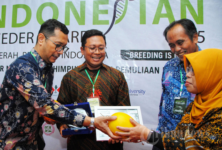 Managing Director PT East West Seed Indonesia (EWINDO) Glenn Pardede (kiri) menunjukkan 1 buah melon varietas unggul kepada Wakil Dekan Faperta IPB University Bidang Sumberdaya, Kerjasama dan Pengembangan Syarifah Iis Aisyah (kanan) disaksikan pakar pemulia tanaman Sobir (kedua kanan) perwakilan penerima penghargaan Indonesian Breeder Award 2025 Dedi Prasetyo (kedua kiri) di Bogor, Jawa Barat, Rabu (19/11/2025). Indonesian Breeder Award bertema Breeding is Giving adalah ajang apresiasi tertinggi bagi para pemulia tanaman (plant breeder) yang telah memberikan kontribusi besar bagi ketahanan pangan nasional wujud komitmen EWINDO, PERIPI dan IPB University mendorong riset dan regenerasi pemulia tanaman, ditunjukkan dari adanya dua pemenang kategori baru kali ini, Young Breeder, yang aktif menghasilkan varietas buah-buahan dan kelapa sawit. Indonesia saat ini hanya memiliki 250 orang pemulia aktif atau hanya 2,5% dari kebutuhan nasional. Tribunnews/Jeprima