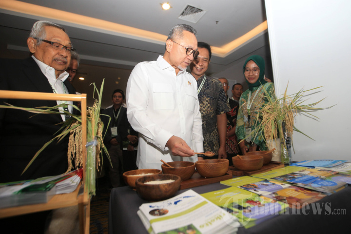 Menteri Koordinator Bidang Pangan Zulkifli Hasan didampingi Ketua Umum PERPADI Sutarto Alimoeso mengunjungi salah satu booth disela-sela peresmian pembukaan International Sustainable Rice Forum (ISRF) 2025 yang diselenggarakan oleh Preferred by Nature di Jakarta, Senin (17/11/2025). Mendorong transformasi praktik pertanian padi yang lebih ramah lingkungan, dan mendukung kesejahteraan petani serta membuka akses pasar untuk hasil pertanian berkelanjutan dan rendah karbon, Preferred by Nature menyelenggarakan event berskala global, International Sustainable Rice Forum (ISRF) 2025 di Jakarta pada 17 - 18 November 2025. TRIBUNNEWS/IRWAN RISMAWAN