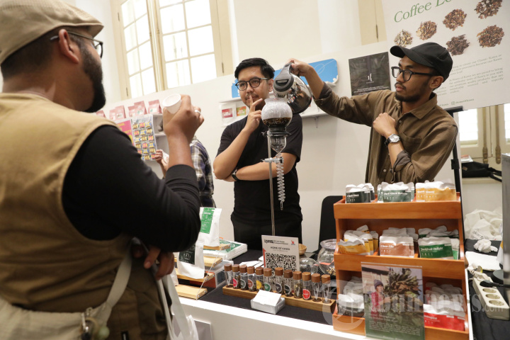 KONFERENSI KOPI - Pengunjung mencari informasi mengenai kopi di salah satu booth saat acara Jakarta International Coffee Conference (JICC) 2025 di Gedung A. A. Maramis, Jakarta Pusat, Kamis (6/11/2025). Konferensi kopi internasional dengan tema 'Thriving Coffee Country' tersebut berlangsung 6 - 8 November dengan mempertemukan para pelaku usaha industri kopi dari hulu hingga hilir yang menjadi sarana berbagi gagasan, membangun jejaring, serta memperkuat ekosistem kopi yang inklusif, inovatif serta sebagai wadah kolaboratif untuk memperlihatkan perkembangan ekosistem kopi Indonesia yang semakin inovatif dan berdaya saing global. TRIBUNNEWS/IRWAN RISMAWAN