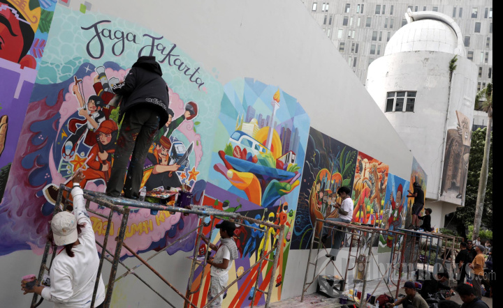 MURAL - Seniman menggambar mural dalam Jakarta Mural Festival 2025 di kompleks Taman Ismail Marzuki (TIM), Cikini, Jakarta, Minggu (16/11/2025). Sebanyak 20 finalis dari 109 pendaftar mengikuti ajang kompetisi Jakarta Mural Festival 2025 bertajuk Jaga Jakarta dalam rangka menyongsong 500 tahun Kota Jakarta sekaligus memeriahkan HUT Ke-57 Pusat Kesenian Jakarta, Taman Ismail Marzuki. TRIBUNNEWS/IRWAN RISMAWAN