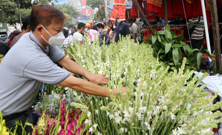 Pedagang bunga potong menawarkan kepada pembeli di Pancoran Mas, Glodok, Jakarta Barat, Minggu (30/1/2022). Beraneka jenis bunga menjadi bagian doa atau sekeder memperindah ruangan saat Imlek. (Warta Kota/Henry Lopulalan)