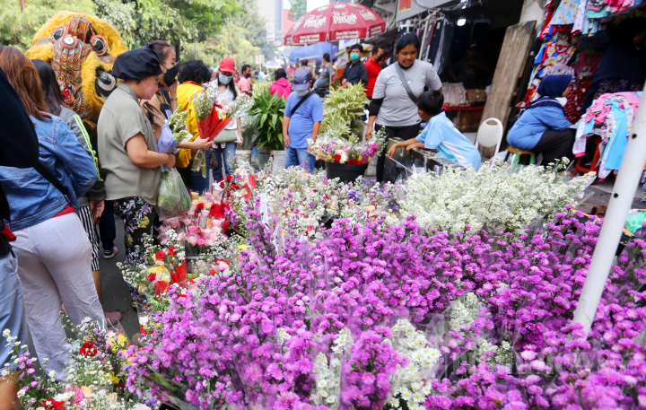 Pedagang bunga potong menawarkan kepada pembeli di Pancoran Mas, Glodok, Jakarta Barat, Minggu (30/1/2022). Beraneka jenis bunga menjadi bagian doa atau sekeder memperindah ruangan saat Imlek. (Warta Kota/Henry Lopulalan)