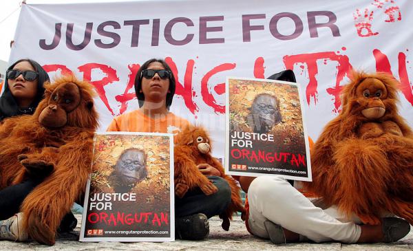 Aktivis Centre for Orangutan Protection (COP) berunjukrasa di sekitar Bundaran HI Jakarta Pusat, membawa boneka orangutan, Rabu (12/10/2011). Unjukrasa dilakukan untuk mendesak Presiden SBY menghentikan pembantaian orangutan yang diduga dilakukan perusahaan perkebunan kelapa sawit di Kalimantan Timur. (tribunnews/herudin)