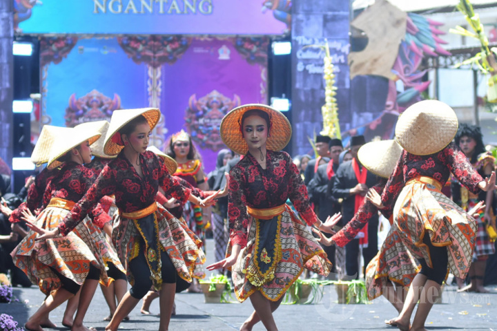 Peserta dari Kecamatan Ngantang, Kabupaten Malang saat mengikuti gelaran Kanjuruhan Culture Carnival (KCC) dalam Rangka Hari Jadi ke-1264 Kabupaten Malang di Jalur Lintas Barat (Jalibar) Kepanjen, Kabupaten Malang, Jawa Timur, Sabtu (31/8/2024). Mengusung tema 'The Beauty of Culture, Art and Tourism' sebanyak perwakilan dari 33 kecamatan di Kabupaten Malang mengikuti gelaran tersebut. SURYA/PURWANTO