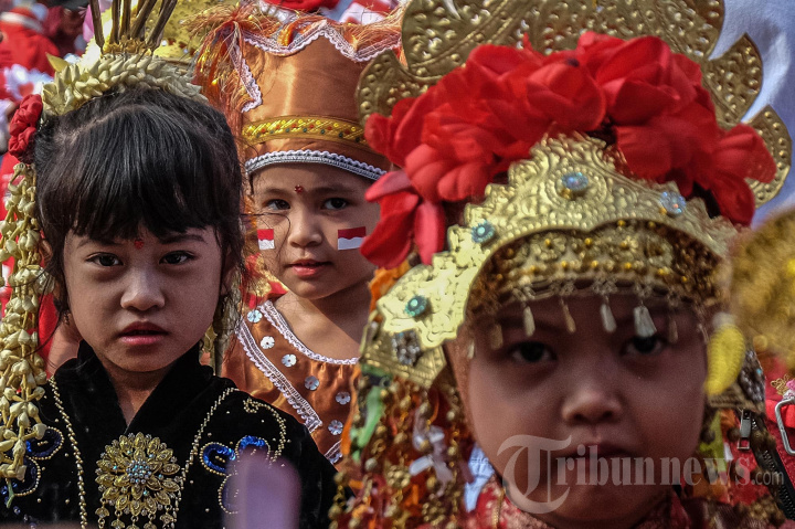 Sejumlah siswa TK mengikuti Karnaval dalam rangka memperingati HUT Kemerdekaan ke-78 RI di Rumah dinas Walikota, Palembang, Senin (28/8/2023). Para siswa TK ini memakai tema baju adat dan profesi yang diikuti TK seluruh kota Palembang. (TRIBUN SUMSEL/ABRIANSYAH LIBERTO)