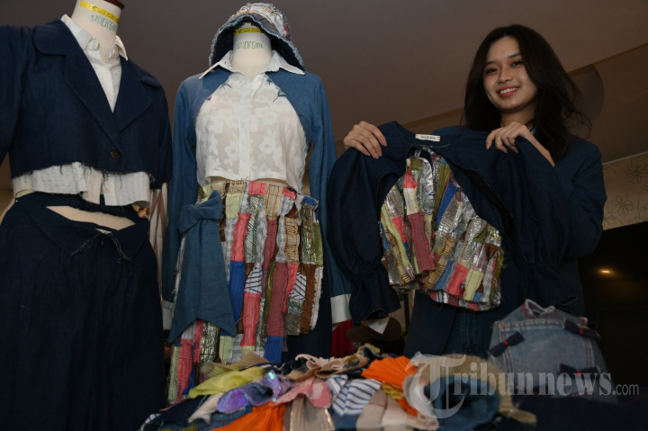 PADUKAN DENIM & PERCA - Calon wisudawan dari Textile and Fashion Design Petra Christian University Fiona Jeannice Sutedja menunjukkan busana daur ulang karyanya di kampus PCU, Selasa (3/9/2024). Karya pemanfaatan kain sisa/ perca yang dipadu dengan bahan denim ini sebagai solusi dari industri fashion yang menghadapi masalah serius terkait limbah akibat produksi yang mengikuti trend mode. SURYA/HABIBUR ROHMAN