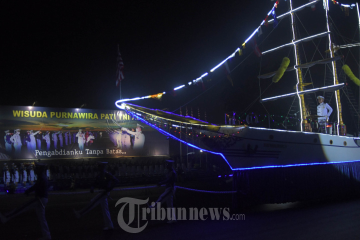 WISUDA PURNA WIRA PATI - Prosesi upacara Wisuda Purna Wira (WPW) Pati TNI AL 2022 yang dipimpin Kasal Laksamana TNI Yudo Margono di Kampus AAL Bumi Moro, Surabaya, Senin (24/10/2022) malam. Sebanyak 82 wisudawan Pati TNI AL mengikuti acara tradisi yang melambangkan berakhirnya masa pengabdian seorang Pati TNI AL untuk kepentingan bangsa dan negara. SURYA/AHMAD ZAIMUL HAQ