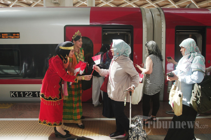 HARI PAHLAWAN - Petugas menggunakan pakaian adat daerah memberi salam hormat saat keberangkatan kereta cepat di Stasiun Kereta Cepat Whoosh Halim, Jakarta Timur, Senin (10/11/2025). Dalam rangka memperingati hari Pahlawan petugas PT Kereta Cepat Indonesia China (KCIC) mengenakan pakaian adat dari sejumlah daerah sebagai bentuk penghormatan kepada para pahlawan bangsa. Tribunnews/Jeprima