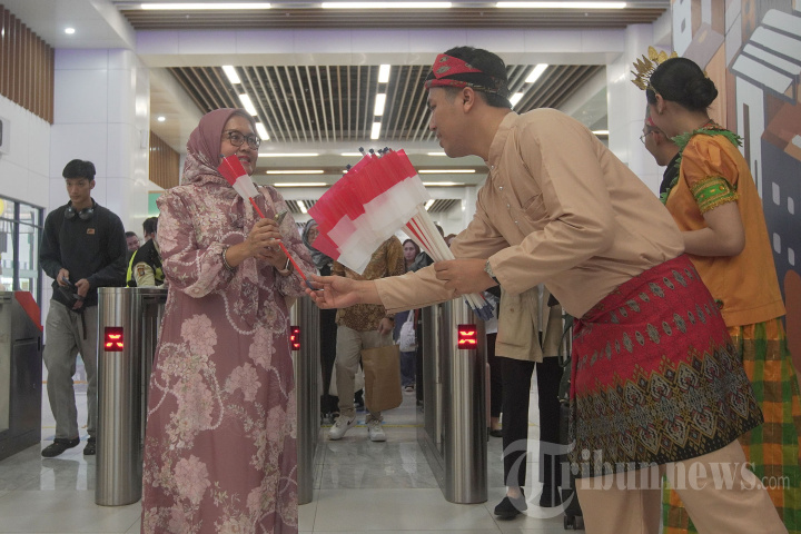 HARI PAHLAWAN - Petugas menggunakan pakaian adat daerah memberikan bendera merahputih kepada penumpang sebelum mesuk kedalam gerbong kereta cepat di Stasiun Kereta Cepat Whoosh Halim, Jakarta Timur, Senin (10/11/2025). Dalam rangka memperingati hari Pahlawan petugas PT Kereta Cepat Indonesia China (KCIC) mengenakan pakaian adat dari sejumlah daerah sebagai bentuk penghormatan kepada para pahlawan bangsa. Tribunnews/Jeprima
