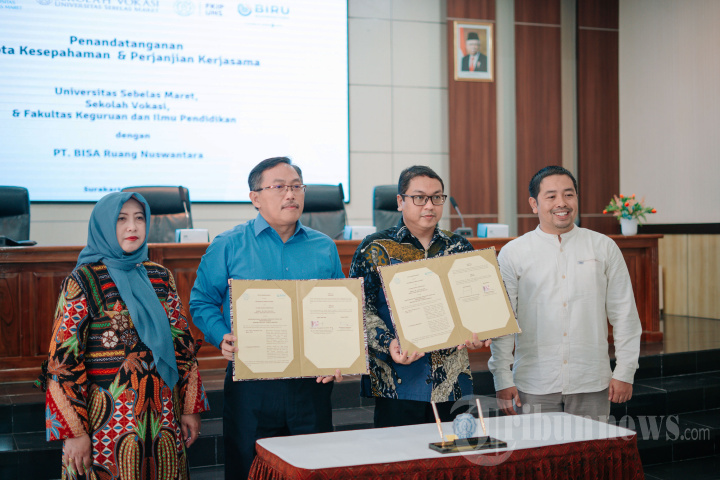 (Dari kiri ke kanan) Plt. Wakil Dekan Sumber Daya Manusia, Keuangan, dan Logistik Fakultas Keguruan dan Ilmu Pendidikan Universitas Sebelas Maret (UNS) Dewi Kusuma Wardani, Direktur Utama PT BISA Ruang Nuswantara (BIRU) Kristiyanto Widiyawan, Plt. Wakil Rektor Perencanaan, Kerjasama, Bisnis dan Informasi UNS Prof. Irwan Trinugroho, dan Plt. Wakil Dekan Perencanaan, Kerjasama, Bisnis dan Informasi Sekolah Vokasi UNS, Herman Saputro dalam penandatanganan kerja sama BIRU dengan Sekolah Vokasi UNS dan FKIP UNS, Jumat (14/7/2023) di Aula Sekolah Vokasi UNS, Surakarta. Kerja sama ini bertujuan mendorong praktik keberlanjutan melalui program pendidikan, penelitian dan pengembangan sumber daya manusia. TRIBUNNEWS/HO