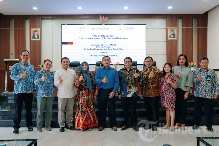 Penandatangan kerja sama PT BISA Ruang Nuswantara (BIRU), anak perusahaan PT Delta Dunia Makmur Tbk., dengan Sekolah Vokasi dan Fakultas Keguruan dan Ilmu Pendidikan (FKIP), Universitas Sebelas Maret Surakarta (UNS), di Aula Sekolah Vokasi UNS, Surakarta, Jumat (14/7/2023). Kerja sama dilakukan untuk menciptakan sinergi yang kuat antara dunia pendidikan dan dunia industri dalam rangka mewujudkan pembangunan yang berkelanjutan dan inklusif melalui peningkatan kualitas sumber daya manusia serta inovasi di bidang sosial lingkungan dan sosial pendidikan. TRIBUNNEWS/HO